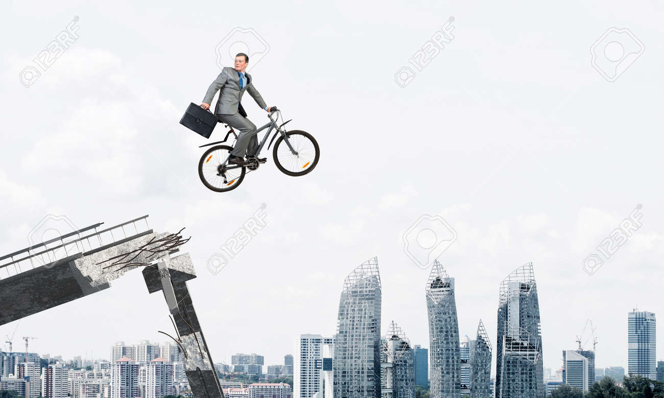 Jumping From Broken Bridge. Businessman jumping cycle