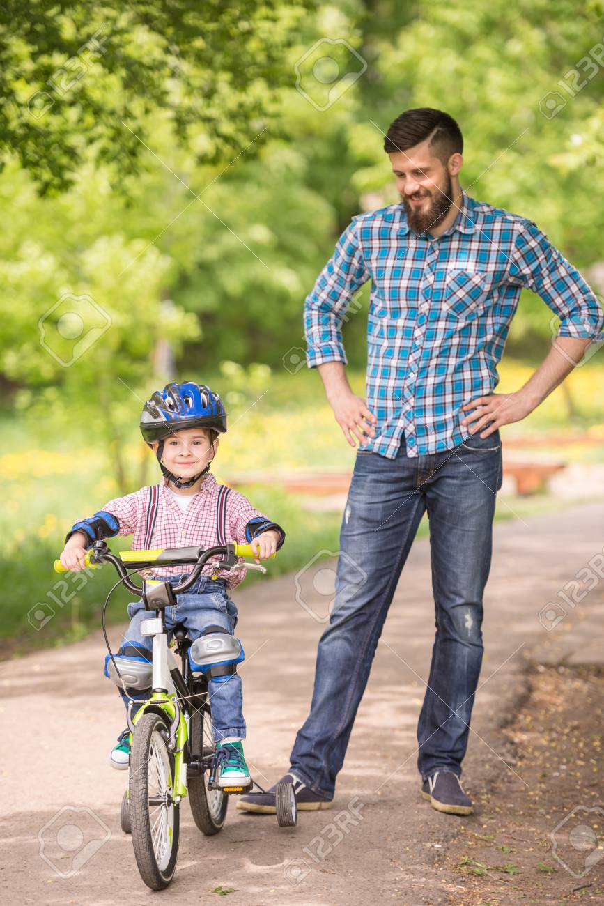 Young Father Teaching Son To Ride teaching son to ride bike