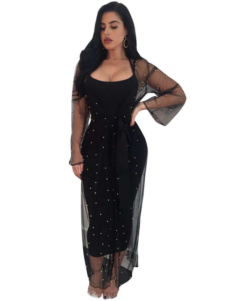 Sheer Long Sleeve Maxi Cardigan black midi dress with sheer sleeves