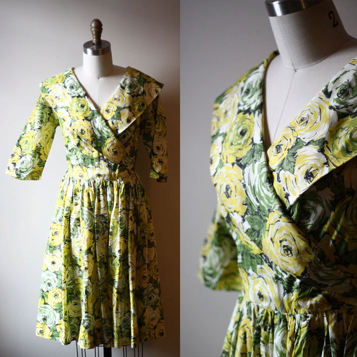 1950s green roses dress // wrap dress bright green wrap dress