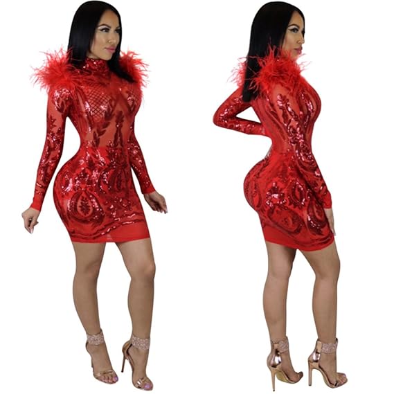 Long Sleeve Party Sheer Bodycon Dress red sequin feather dress