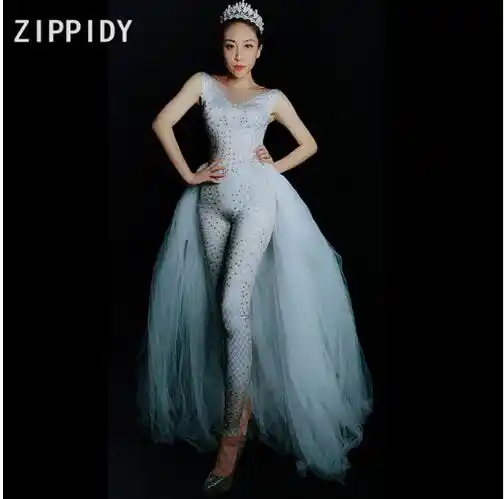 Fashion Silver Rhinestones Spandex white mesh outfit