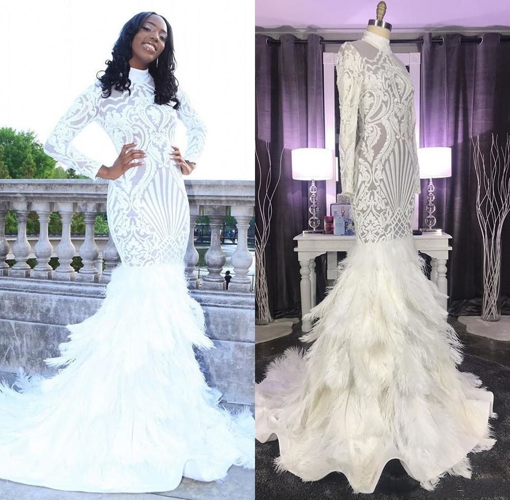 white prom dress with feathers