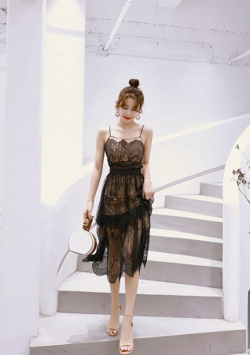 Black Sexy Strapless Midi Dress lace swing dresses