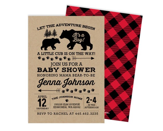 Lumberjack Wilderness Bear Rustic Boy buffalo plaid baby shower invites