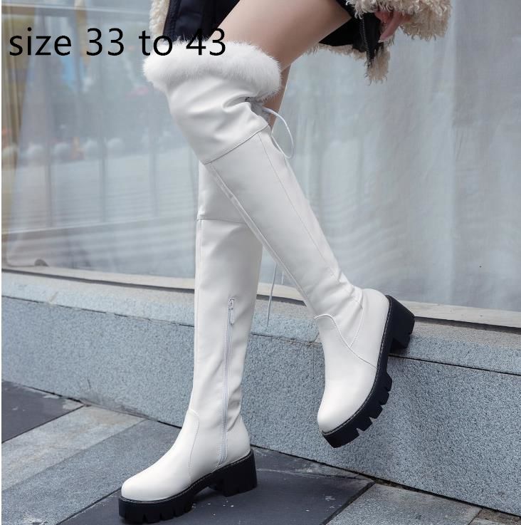 Fur Boots Chunky Heel Over The Knee white thigh high boots chunky heel