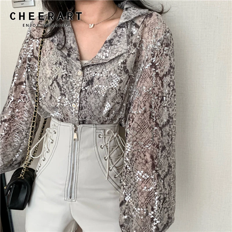 CHEERART Snake Print Sequin Blouse sequin blouse long sleeve