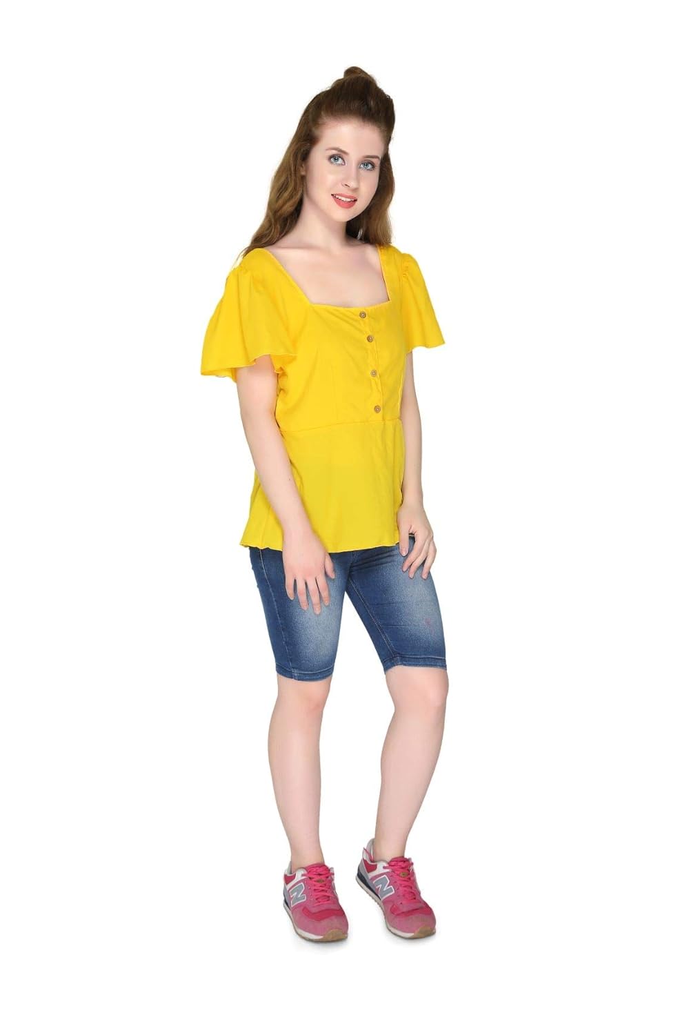 Buy ORIZIA Women Square Neck Button UP bright yellow top womens