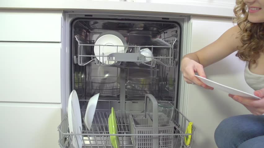 Young Woman Washing Dishes in : video dishes in washing machine