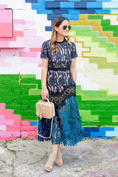 Navy Lace Self Portrait Dresses, Beige shoes for navy lace dress