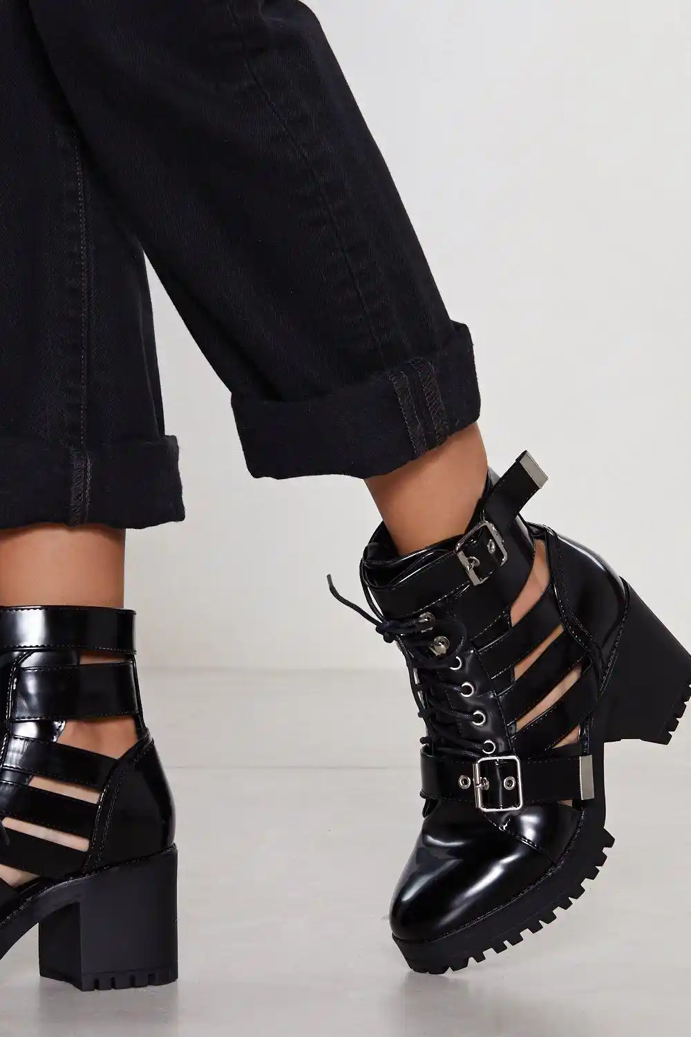 Black Cut Out Boots Round Toe Laser Cut cut out block heel boots