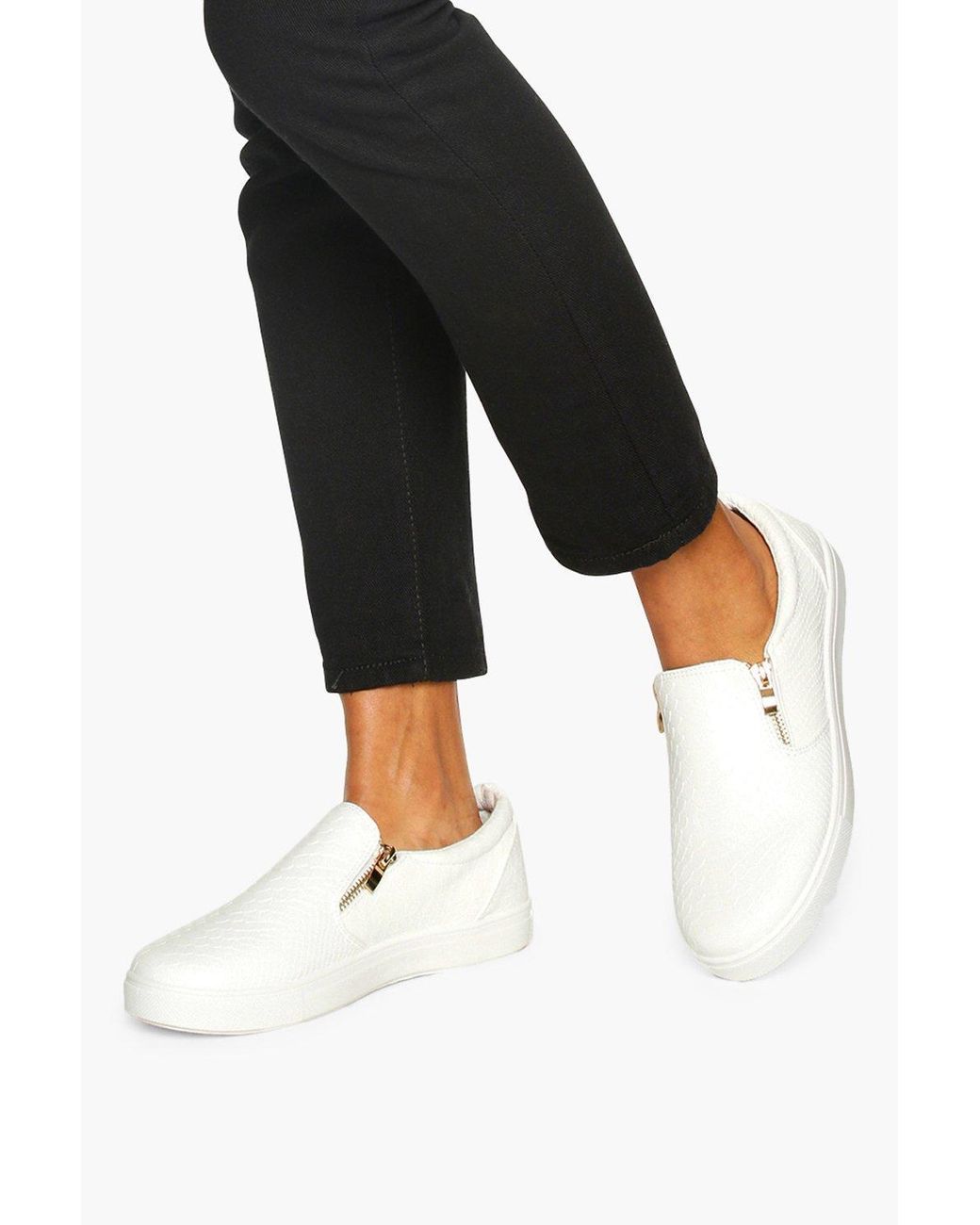 Boohoo Wide Fit Snake Effect Zip Side white plimsolls womens wide fit